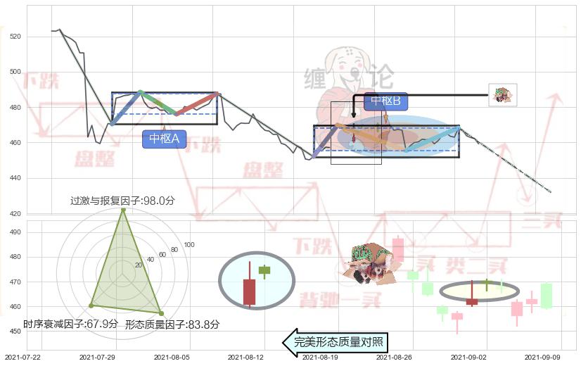 从2021-08-16 10:00至2021-08-19 12:00,共包含24个小时,阶段股价下跌-12.83%,阶段股价变动位移路程比: 1 : 1.5,2021-08-19 09:00向↘︎形成缺口,跳空下跌-9.31%˚