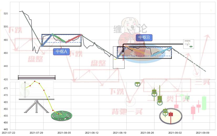 ➣ 缠论中枢点:猜想破位中枢B后持续下拉 → 下跌 → 破位中枢B支撑 → 持续趋势跟踪