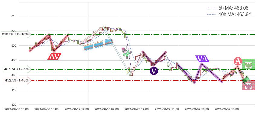♘ 阻力价格位467.74,可信任强度64.75%,距离最后交易2021-09-09 14:00形成的收盘价格459.25相差 +1.85%