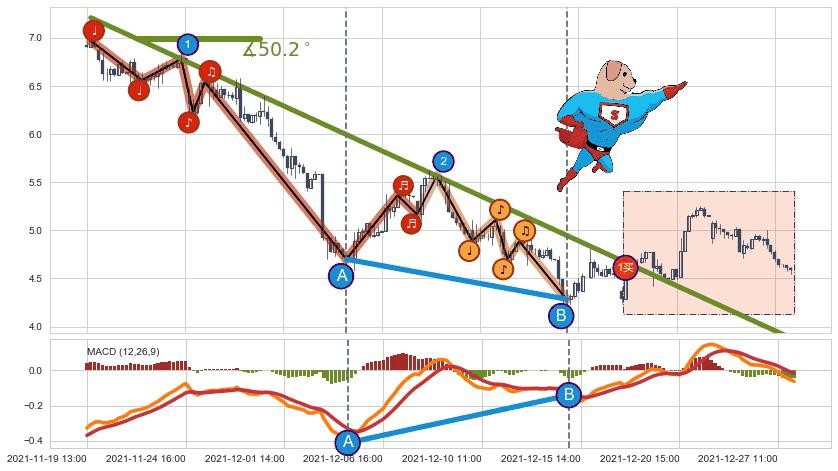 ➢ 2021-11-19 14:00-2021-12-15 11:00下跌趋势存在反转上涨[机会],其原下跌趋势的阻力位(3.883)已被突破[强支撑信号],原下跌趋势角度: 50.2˚