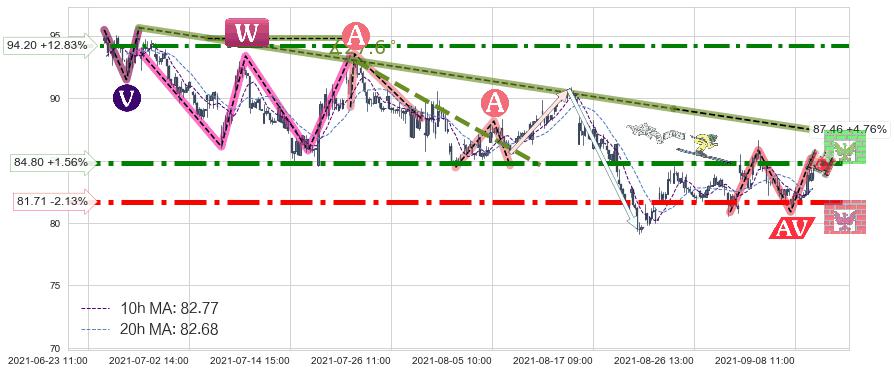 ♘ 阻力价格位84.80,可信任强度87.35%,距离最后交易2021-09-09 14:00形成的收盘价格83.49相差 +1.56%