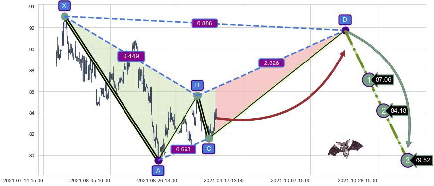 ➣ 谐波蝙蝠:b下跌接近c:猜想支撑性拉升 → 上涨 →【拐点】支撑临近 → 大趋势均值回复