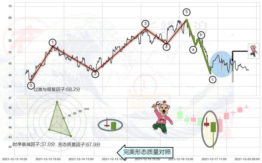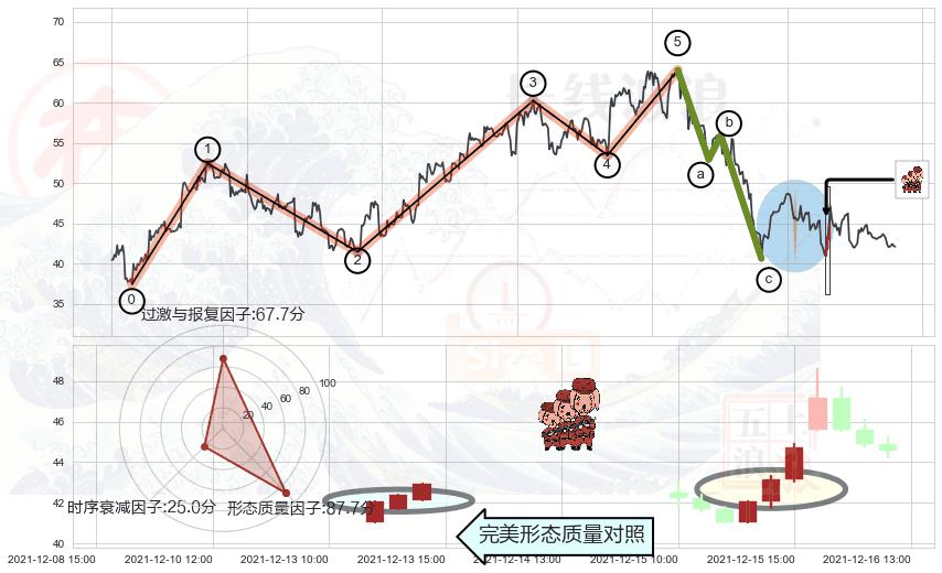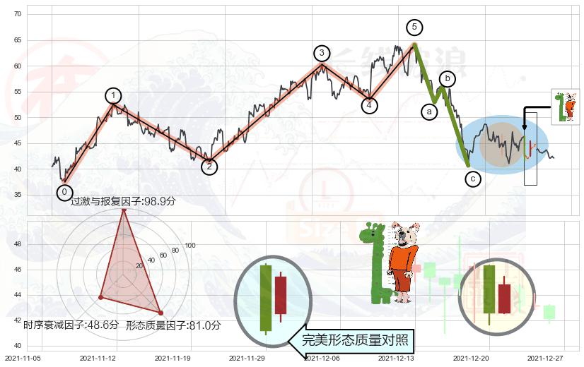 从2021-11-22 09:00至2021-12-06 09:00,共包含63个小时,阶段股价下跌-43.61%,阶段股价变动位移路程比: 1 : 2