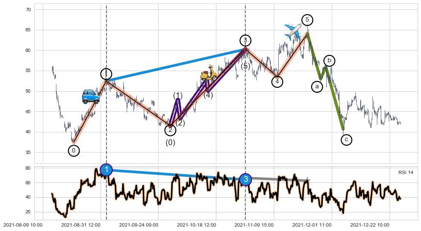➢ 第一, 三驱动浪端点:【RSI】走势出现【常规背离 & 反转信号】背离程度50.02%,背离夹角角度52.5˚,背离程度较小
