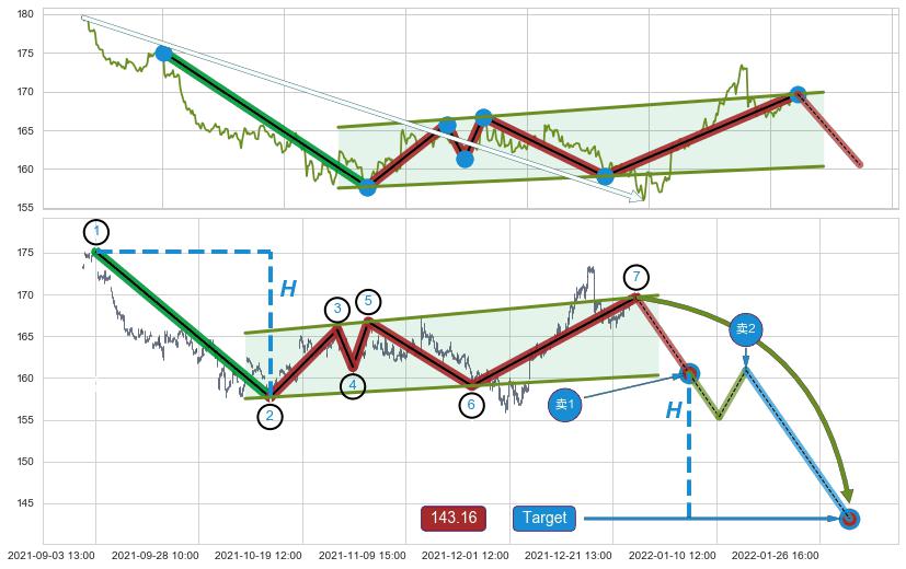 ➣ 升旗形:猜想临近关键支撑位突破点 → 临近拐点下跌 → 风险信号 → 大趋势均值回复