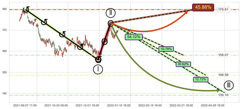 ➣ 调整浪已超过预测的c点位置,后续大趋势循环浪继续下跌概率54.12%,谨慎做多