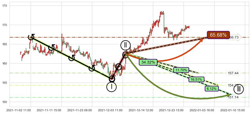 ➢ 循环浪继续向下【最高】位置(12-29:14, 157.44),匹配聚类样本比例34.09%, 可能性概率11.70%