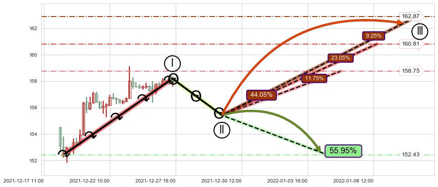 ➣ 循环浪继续向上【平均值】位置(01-06:13, 160.81),匹配聚类样本比例52.33%, 可能性概率23.05%