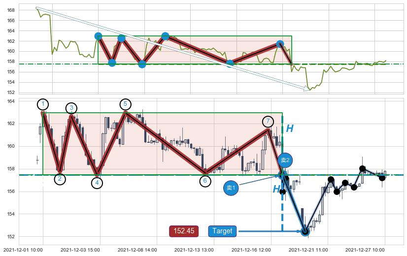 ➣ 【卖2】: 保守型 卖点→(12-17:10: 157.21 )形成下跌矩形整理突破后的【回抽确认】