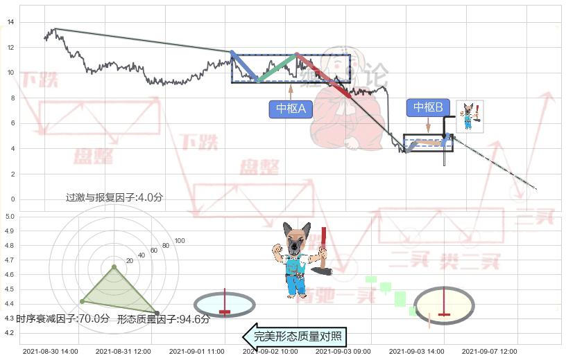 从2021-04-06 15:00至2021-08-25 12:00,共包含602个小时,阶段股价下跌-83.62%,阶段股价变动位移路程比: 1 : 10,下跌趋势角度: 18.5,2021-08-16 09:00向↘︎形成缺口,跳空下跌-38.22%˚