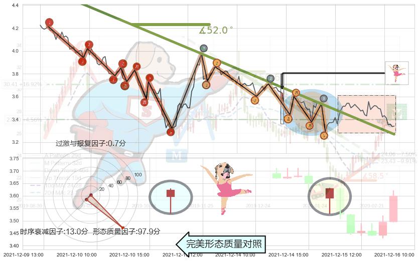 从2021-11-19 14:00至2021-12-21 12:00,共包含152个小时,阶段股价下跌-16.36%,阶段股价变动位移路程比: 1 : 9,下跌趋势角度: 52.0