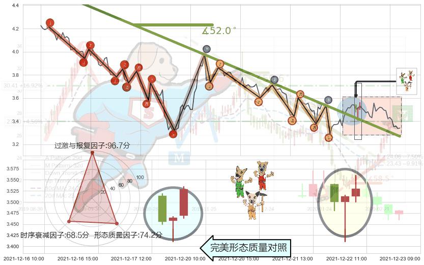 从2021-12-07 14:00至2021-12-21 12:00,共包含74个小时,阶段股价下跌-11.52%,阶段股价变动位移路程比: 1 : 6,下跌趋势角度: 41.2