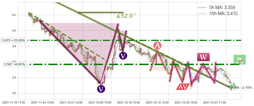 ➣ 2021-11-19 14:00-2021-12-21 12:00下跌趋势存在反转上涨[机会],虽然原下跌趋势的阻力位(3.268)已被突破,但其阻力效果尚存,原下跌趋势角度: 52.0˚
