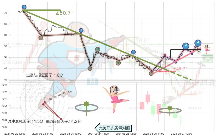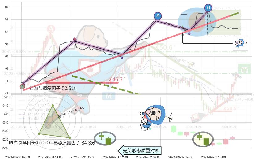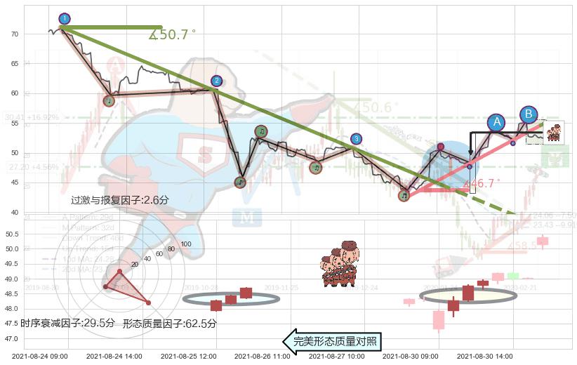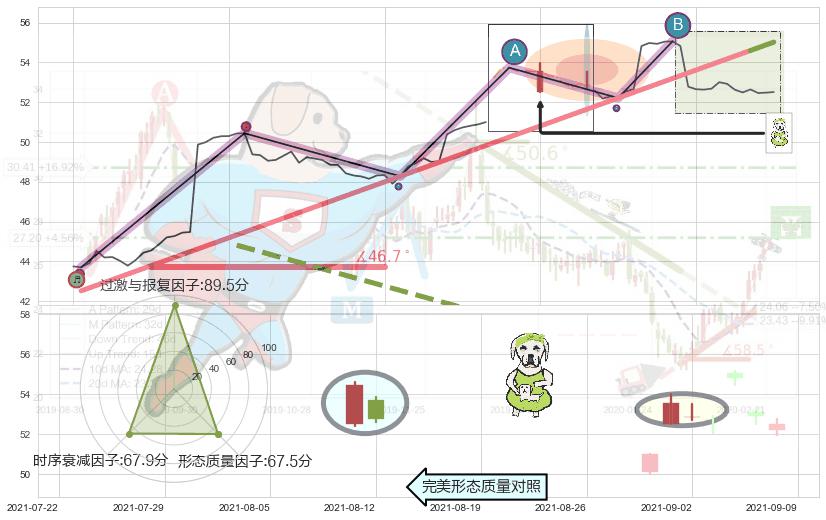 从2021-08-19 13:00至2021-09-09 11:00,共包含87个小时,阶段股价上涨19.42%,阶段股价变动位移路程比: 1 : 2,上涨趋势角度: 46.7