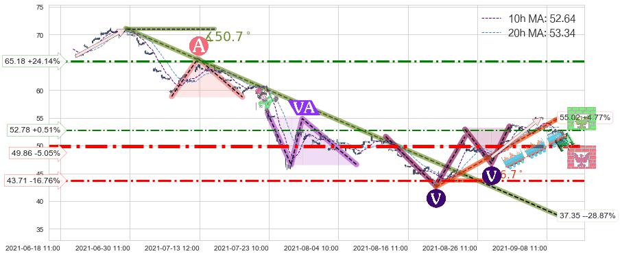 ➢ 2021-08-19 13:00-2021-09-09 11:00上升趋势存在反转[风险],其原上升趋势的支撑位(55.02)已破位[强阻力信号],原上升趋势角度: 46.7˚
