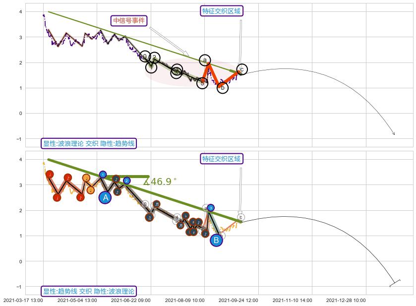 从2021-06-16 12:00至2021-08-23 09:00,共包含281个小时,阶段股价下跌-42.91%,阶段股价变动位移路程比: 1 : 10,下跌趋势角度: 15.7