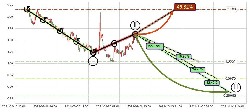 ➣ 调整浪已超过预测的c点位置,后续大趋势循环浪继续下跌概率53.18%,谨慎做多