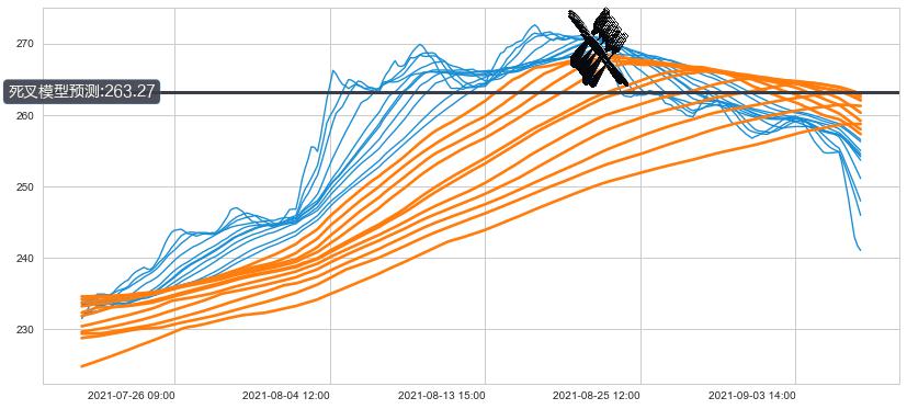 ➢ 40小时均线于(08-23 11:00: 269.84)形成【死叉】基于【死叉历史模型】预测死叉后最低波谷价格: 265.08, 死叉后最低价格239.97,已经下跌超出预测最低波谷价格, 预期反弹