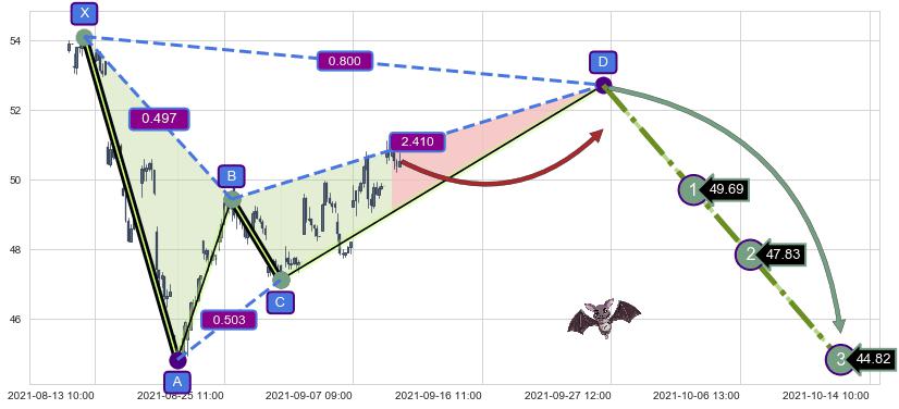➢ 谐波蝙蝠:b下跌接近c:猜想支撑性拉升 → 上涨 →【拐点】支撑临近 → 大趋势均值回复