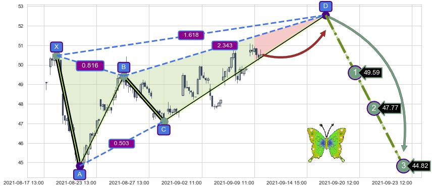 ➢ 谐波蝴蝶:临近d点:猜想c拉升到达d点后泄力性下沉下跌(均值回复)