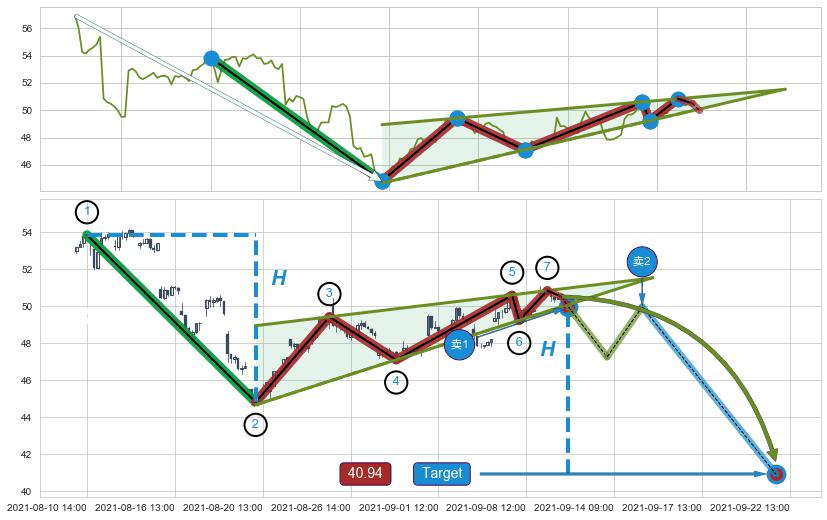 ➢ 最小中继整理跌幅→𝐇: 9.03 (𝐇楔型旗杆的长度:楔型起点→顶点)