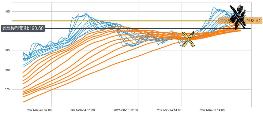 ➣ 34小时均线于(09-08 14:00: 194.49)形成【死叉】基于【死叉历史模型】预测死叉后最低波谷价格: 191.93, 死叉后最低价格191.74,虽然已经到达预测最低波谷价格,但耗时间很短动能很强, 预期继续下跌