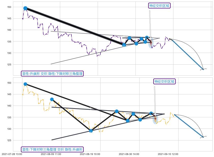 ➢ 升旗形与下降对称三角整理信号事件周期长度级别相同,同周期信号事件