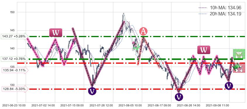 ♘ 阻力价格位137.12,可信任强度92.26%,距离最后交易2021-09-09 14:00形成的收盘价格136.09相差 +0.76%
