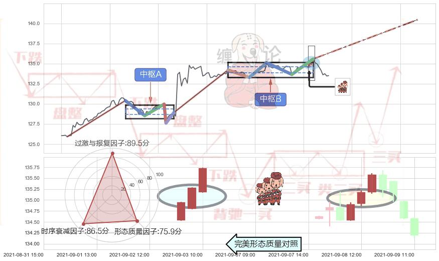 ➣ 【中枢B】:08-30:09-09-08:13,中枢由5笔构成,共45交易小时, ZG=134.21, ZD=133.66