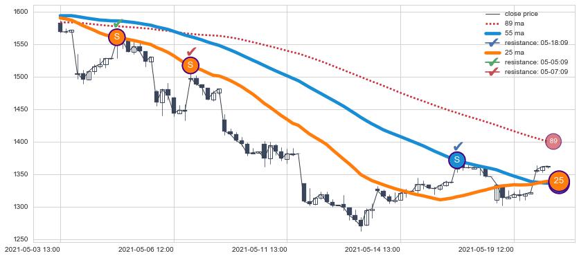➣ 90小时均线于(07-21 09:00: 1531.74)形成【金叉】基于【金叉历史模型】预测金叉后最高波峰价格: 1613.98, 金叉后最高价格1966.67,已经上涨超出预测最高波峰价格, 预期回调