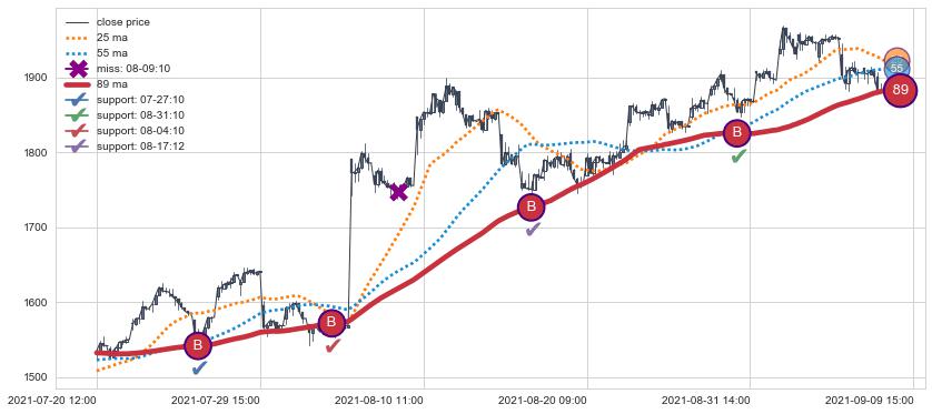 ➢ 89小时均线于(07-21 09:00: 1531.39)形成【金叉】基于【金叉历史模型】预测金叉后最高波峰价格: 1613.45, 金叉后最高价格1966.67,已经上涨超出预测最高波峰价格, 预期回调