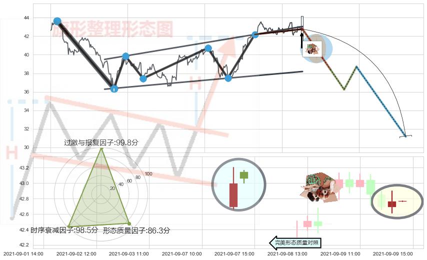 ➢ 🕰 价格走势在2021-09-09 14:00:00至2021-09-09 15:00:00期间形成顶部尽头线(下山虎),残存影响值:-7.40