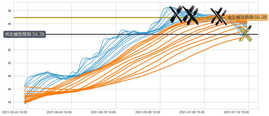 ➢ 21小时均线于(07-13 13:00: 56.90)形成【死叉】基于【死叉历史模型】预测死叉后最低波谷价格: 55.23, 死叉后最低价格53.90,已经下跌超出预测最低波谷价格, 预期反弹