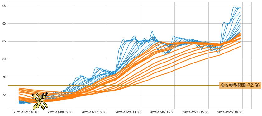 ➢ 90小时均线于(10-27 14:00: 68.25)形成【金叉】基于【金叉历史模型】预测金叉后最高波峰价格: 73.45, 金叉后最高价格94.90,已经上涨超出预测最高波峰价格, 预期回调
