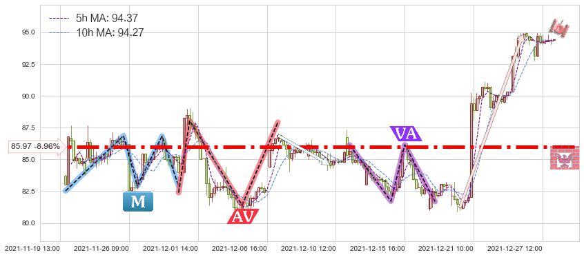 ♘ 支撑价格位85.97,可信任强度89.54%,距离最后交易2021-12-27 16:00形成的收盘价格94.43相差 -8.96%