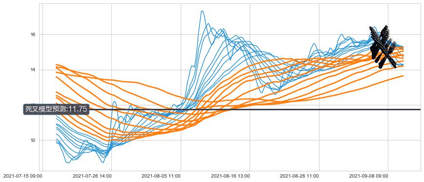 ➢ 80小时均线于(09-07 11:00: 15.04)形成【死叉】基于【死叉历史模型】预测死叉后最低波谷价格: 11.02, 死叉后最低价格13.66,尚未达到预测最低波谷价格, 预期继续下跌