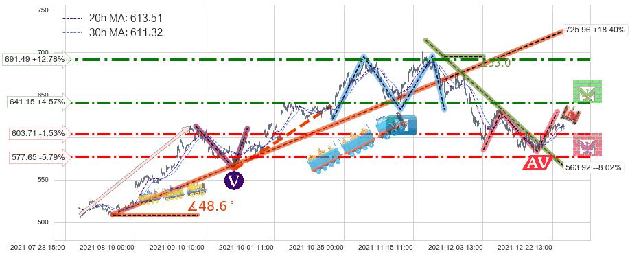 ♘ 阻力价格位691.49,可信任强度73.85%,距离最后交易2021-12-27 16:00形成的收盘价格613.12相差 +12.78%