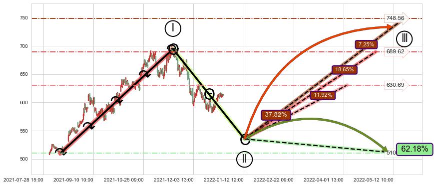 ♘ 支撑价格位603.71,可信任强度67.50%,距离最后交易2021-12-27 16:00形成的收盘价格613.12相差 -1.53%
