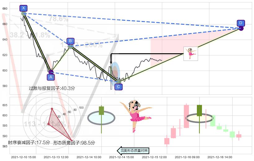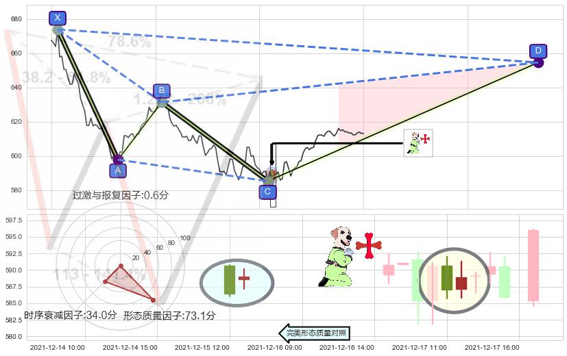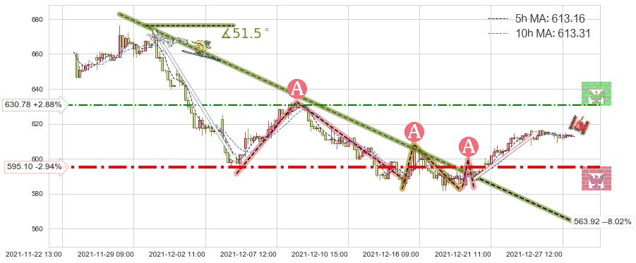 ♘ 支撑价格位595.10,可信任强度84.38%,距离最后交易2021-12-27 16:00形成的收盘价格613.12相差 -2.94%