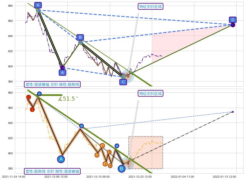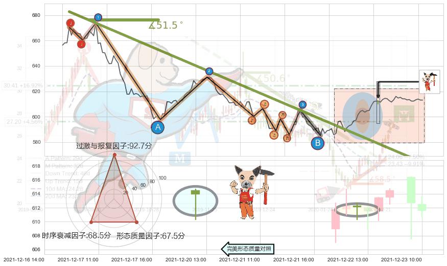 ➢ 2021-11-17 14:00-2021-12-22 10:00下跌趋势存在反转上涨[机会],其原下跌趋势的阻力位(563.92)已被突破[强支撑信号],原下跌趋势角度: 53.0˚
