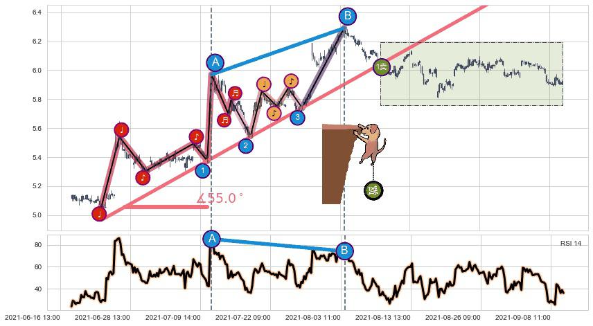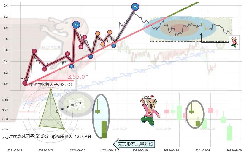 ➣ 2021-06-23 11:00-2021-08-17 10:00上升趋势存在反转[风险],其原上升趋势的支撑位(6.74)已破位[强阻力信号],原上升趋势角度: 55.0˚