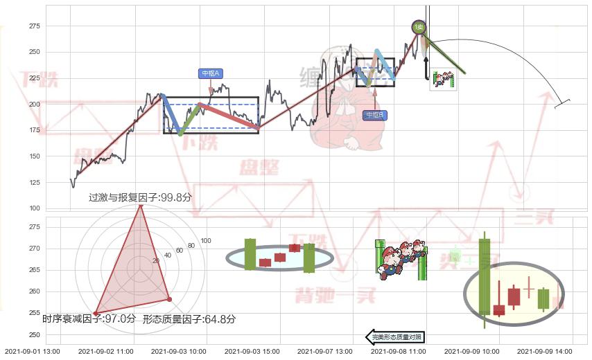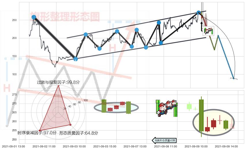➢ 🕰 价格走势在2021-09-09 09:00:00至2021-09-09 13:00:00期间形成下降三部曲(降势三鹤),残存影响值:-7.26