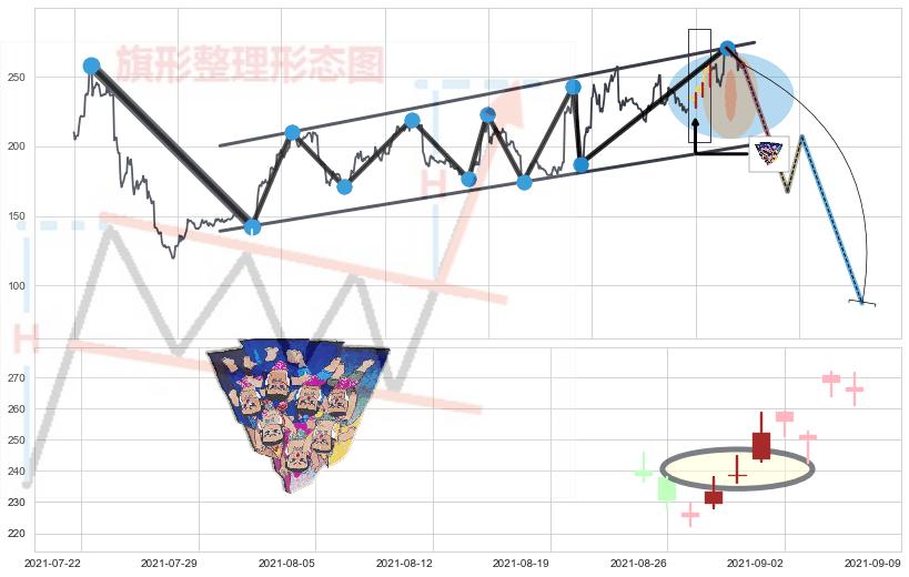 ➣ 升旗形:猜想临近关键支撑位突破点 → 临近拐点下跌 → 风险信号 → 大趋势均值回复