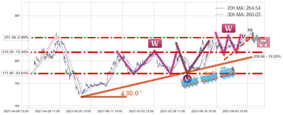 ♘ 支撑价格位219.35,可信任强度88.31%,距离最后交易2021-09-09 14:00形成的收盘价格258.77相差 -15.24%