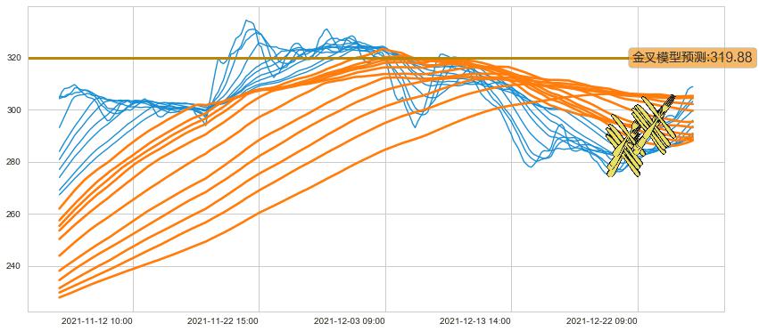 ➢ 70小时均线于(12-21 13:00: 289.96)形成【金叉】基于【金叉历史模型】预测金叉后最高波峰价格: 314.39, 金叉后最高价格309.45,尚未达到预测最高波峰价格, 预期继续上涨