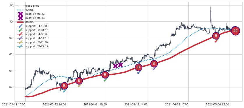 ➢ 最优均线组合共正确确认支撑阻力信号15处,正确确认率 71.43%