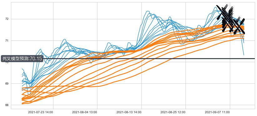 ➣ 70小时均线于(09-08 14:00: 71.64)形成【死叉】基于【死叉历史模型】预测死叉后最低波谷价格: 70.14, 死叉后最低价格69.66,已经下跌超出预测最低波谷价格, 预期反弹