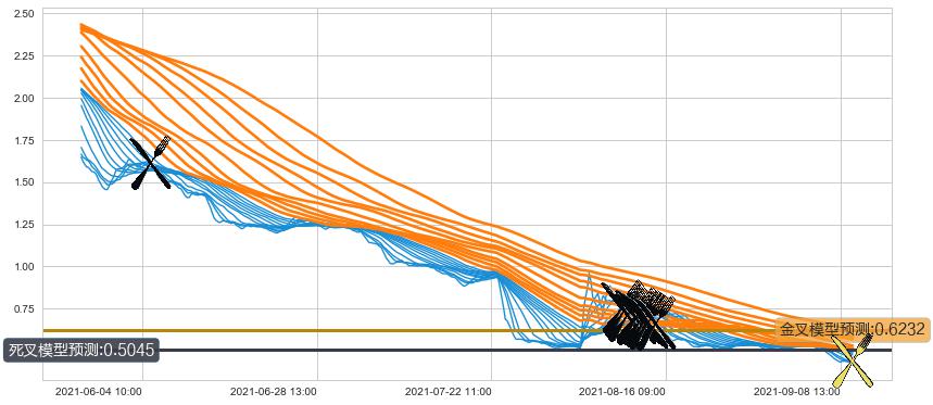 ➢ 34小时均线于(08-09 14:00: 0.7314)形成【死叉】基于【死叉历史模型】预测死叉后最低波谷价格: 0.5916, 死叉后最低价格0.42200,已经下跌超出预测最低波谷价格, 预期反弹