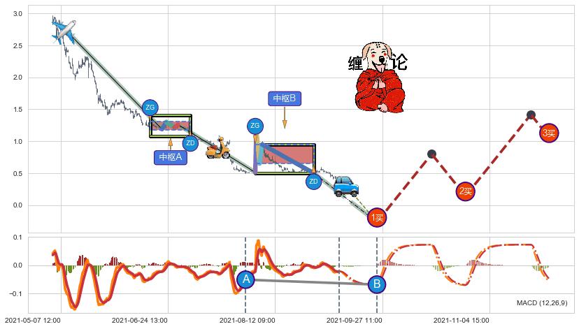 ➣ 缠论中枢点:下降缠中枢B破位后距离1买距离较远,随后猜想后续持续下跌(趋势跟踪)