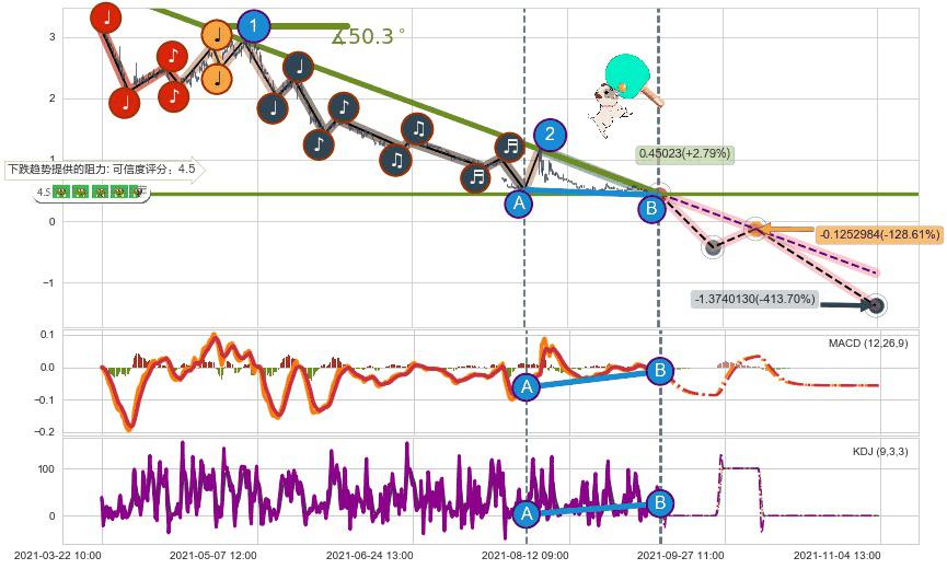 ♘ 在最后的下跌阶段2021-03-22 10:00至2021-09-09 14:00,存在 持续未破位的阻力位 ,阻力价格0.45023,可信任强度88.80%,其距离最后价格0.43800相差 +2.79%